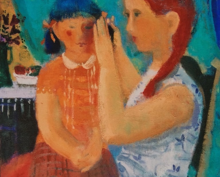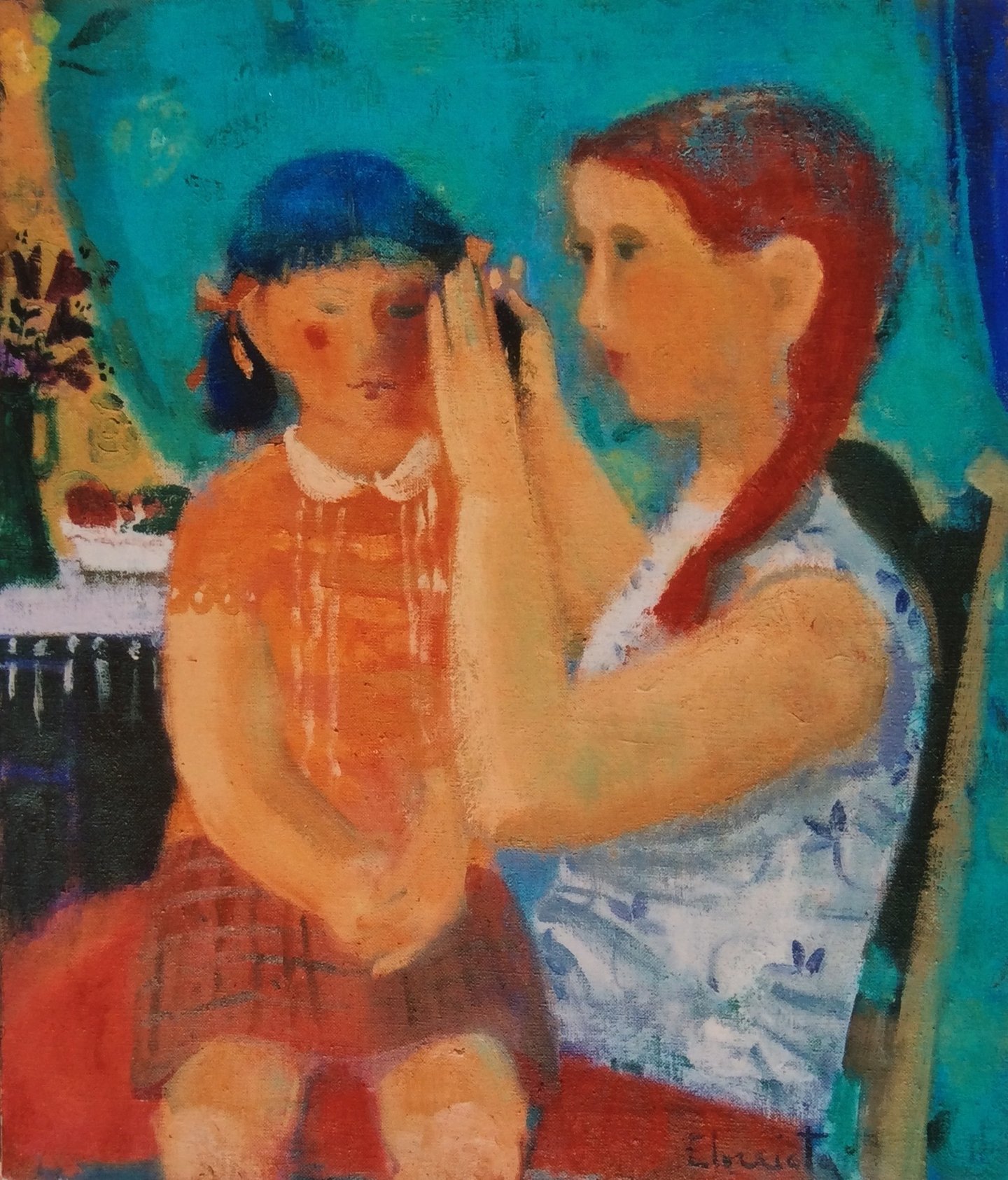 El tratamiento de la figura es otro mundo, lo más personal de Belén Elorrieta: maternidad, niños y un lugar de fondo envuelto en la necesidad del color: ‘Niña en hombros’, ‘En la terraza’, ‘Escena familiar’, ‘En el puerto’, ‘Niños en la fuente’, ‘Maternidad con fondo azul’, ‘Maternidad con pueblo y barcas’. Cambia la mirada. Es una observación frontal, esquemática, reducido a la síntesis del gesto ingenuo. La actitud es festiva y aquí, desde cualquier imagen, todo el mundo tiene derecho a la felicidad. Sorprende la reflexión que propone en ‘Niños en la habitación azul’, desde la insinuación de lo que puede ser. Una historia sin final.