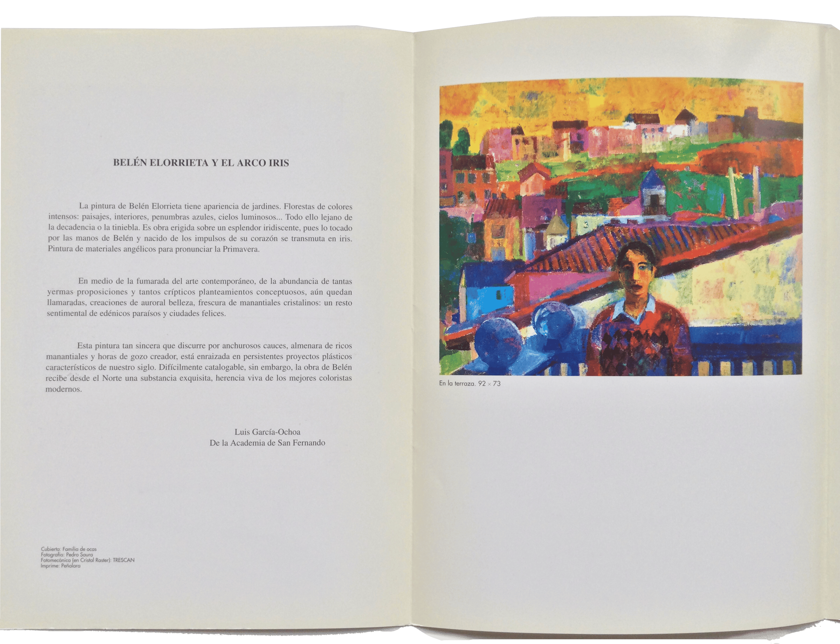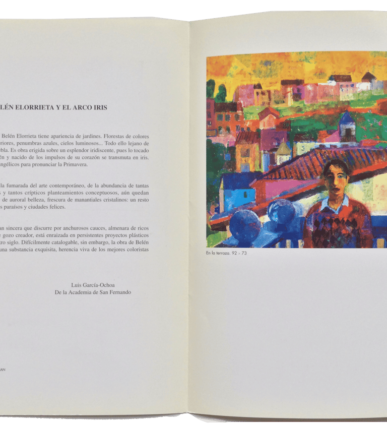 El color es sabido, pero hay pomposidad en la manera de tratarlo, pues el pincel de Belén Elorrieta lo distribuye con una “aparente” ingenuidad, con una estudiada sencillez, que elimina del cuadro toda sensación de pretenciosidad. En esa sencillez, cordial y humana, radica uno de los encantos de esta grata pintura, alivio de caminantes en un camino tan frecuentemente inclinado al feísmo como el de la plástica contemporánea.