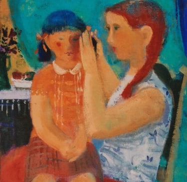 Las figuras, incluso las infantiles, suelen aparecer pensativas, y de hecho los colores no son más expansivos que las formas, lo que templa de contención el despliegue de los primeros.. A veces hasta adoptan una pose levemente hierática, evitando caer en la superficialidad decorativa o una ingenuidad tan ficticia como fácil.